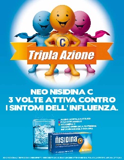 La comunicazione punta tutto su neoNisidina C Effervescente rilanciando la formula attraverso una incisiva campagna stampa su periodici nazionali, settimanali e mensili per un totale di 45.740.000 contatti; inoltre 'ecomoving', un impattante strumento dinamico che, grazie ai colori e alla sua luminosità, è efficace con la sua presenza 'ecologica anche nei centri storici pedonalizzati. La campagna prevede materiali punto vendita, come espositori da banco e da terra e cartelli vetrina; ovunque neoNisidina C Effervescente affida alla simbologia di tre simpatici e ottimisti 'supereroi' in calzamaglia gialla, azzurra e rosa, posa assertiva e volto sorridente come gli emoticon, il messaggio della forza dei suoi tre principi attivi, con la promessa di essere '3 volte attiva contro i sintomi dell'influenza'.
