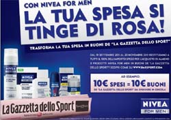 Beiersdorf sceglie Adverteam per la realizzazione della campagna pubblicitaria su stampa e dei materiali POP a supporto del progetto 'Nivea for Men -La tua spesa si tinge di rosa' in co-marketing con La Gazzetta dello Sport. L’operazione a premi, messa a punto da Beiersdorf e TLC Italia, è iniziata il 19 settembre e si concluderà il 20 novembre 2011: tutti coloro che acquisteranno 3 o più prodotti Nivea for Men (tra cui almeno 1 prodotto barba, dopobarba o cura viso) riceveranno il 100% della cifra spesa sotto forma di buoni per comprare in edicola La Gazzetta dello Sport. Basterà conservare lo scontrino fiscale e seguire le istruzioni riportate sul sitowww.barsport.com.