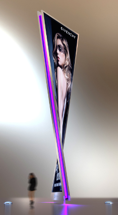 diventare l’immagine iconica della comunicazione pubblicitaria dello scalo veneziano. Si tratta di una torre elicoidale costituita da una cornice in acciaio alta 18 metri e larga 6 dotata di un profilo laterale ridottissimo, stilizzato da una linea di luce colorata che potrà cambiare tonalità in relazione al suo contenuto pubblicitario. Tra i suoi quattro lati è tensionato un film vinilico stampato ad alta definizione . Una rotazione di 45° sull’asse centrale dei lati più corti conferisce a questo Billboard una linea spettacolare ed inedita che, oltre a dare tridimensionalità all’immagine ne enfatizza la forza comunicativa.