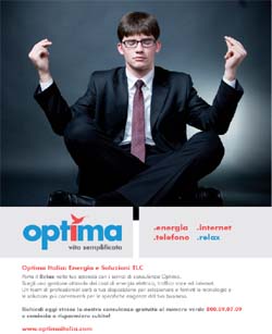 Optima Italia S.p.A, società italiana attiva nel mercato delle telecomunicazioni e dell’energia, ha appena lanciato su scala nazionale la campagna adv per comunicare la propria offerta integrata di servizi di telefonia e Internet in grado di 'semplificare la vita' alle aziende. Il budget per la campagna è di 90 mila euro e la pianificazione prevede una fitta presenza su Internet e stampa business per una durata di sei mesi. La comunicazione online è composta da una campagna banner sui principali siti italiani come IlSole24ore.com, Repubblica.it, PMI.it, etc.