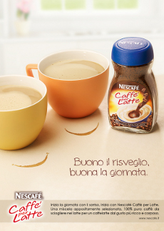 Il concept dello spot viene declinato anche sulla carta stampata e giocato sulla semplicità di un rito irrinunciabile, la colazione come momento positivo per affrontare la giornata a base di un caffelatte ricco e corposo. Due i soggetti per un visual dalle linee morbide e dai colori pastello. In entrambi su una tavola campeggiano delle tazze di caffelatte che richiamano il sapore e l’aroma tipici di tutte le cucine al mattino; accanto il barattolo di Nescafé Caffè per Latte e a fare da contorno delle piccole “sbavature” di caffelatte sulla tavola che ammiccano alla solarità e al buon umore di un sorriso. Come per lo spot il claim rimane lo stesso: “Buono il risveglio, buona la giornata”.Agenzia: McCann Erickson Italia