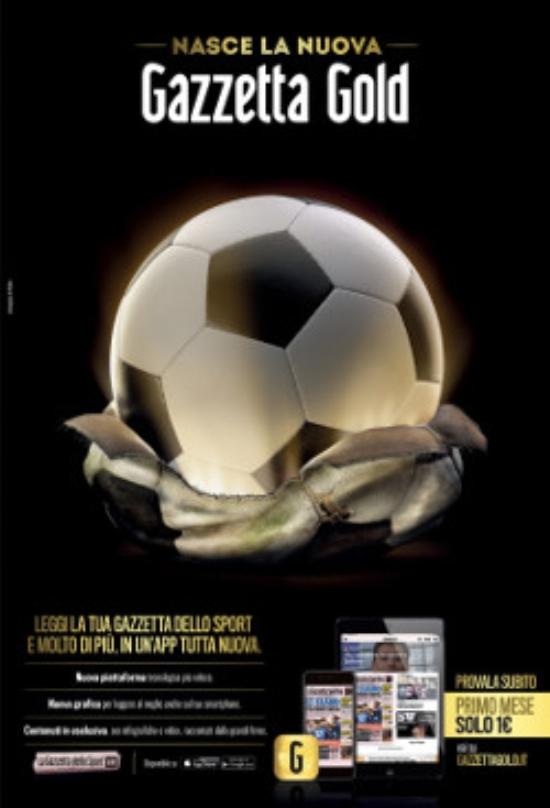 La campagna, con una metafora, mostra come Gazzetta Gold si sia spogliata del “vecchio” e abbia ottenuto una nuova vita grazie a nuove potenzialità: un pallone da calcio che perde la vecchia pelle e si mostra ora in tutto il suo splendore. La campagna sarà veicolata su stampa e web con una campagna banner.