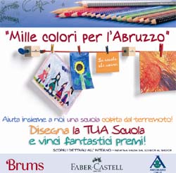 A sostegno dell’iniziativa, Brums ha ideato il concorso di disegno “Mille Colori per l’Abruzzo”, con la collaborazione dell’Antoniano e di Faber-Castell, azienda leader nel settore degli strumenti per la scrittura e per le belle arti. Il concorso, attivo dal 20 agosto al 31 ottobre 2009, invita i piccoli clienti Brums dai 4 anni in poi, a realizzare un disegno da inviare a Preca Brummel insieme ad una cartolina compilata con i propri dati. Gli elaborati ricevuti saranno valutati da una giuria autorevole che premierà i 30 disegni più belli con fantastici premi messi a disposizione da Faber-Castell. Inoltre i 30 disegni vincitori saranno inseriti in un libro speciale dedicato al concorso. Anche senza alcuna partecipazione al concorso, sarà possibile contribuire finanziariamente alla ricostruzione della scuola elementare, facendo una donazione a favore del progetto Il Fiore della Solidarietà di Antoniano Onlus.