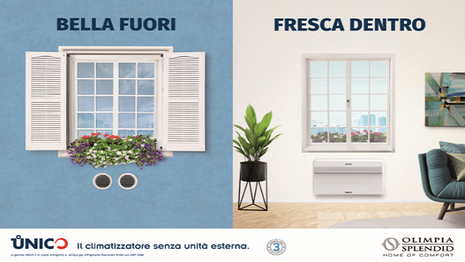 “Da qui la volontà di mostrare l’altra faccia del prodotto e chiarire che con Unico ogni casa può finalmente essere confortevole e bella, sia fuori che dentro.” Bella fuori, fresca dentro è infatti l’headline della nuova creatività pubblicitaria di Unico che porterà gli italiani all’interno della casa di Giovanni, un consumatore tipo di Olimpia Splendid, che ha scelto il climatizzatore senza unità esterna per non rubare spazio sul terrazzo agli aperitivi con gli amici e rinfrescare la sua casa con la massima attenzione a forme, colori e materiali.