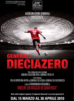 La creatività, interamente basata sul format di un trailer cinematografico, è declinata, con uno spot da 30” dai toni epici, sulle principali radio nazionali ed una campagna stampa attraverso memo stick sulla Gazzetta dello Sport. La campagna promozionale Dieciazero di Assicurazioni Generali mette in palio tre viaggi premio per due persone in Sudafrica, dal 10 al 15 luglio 2010.