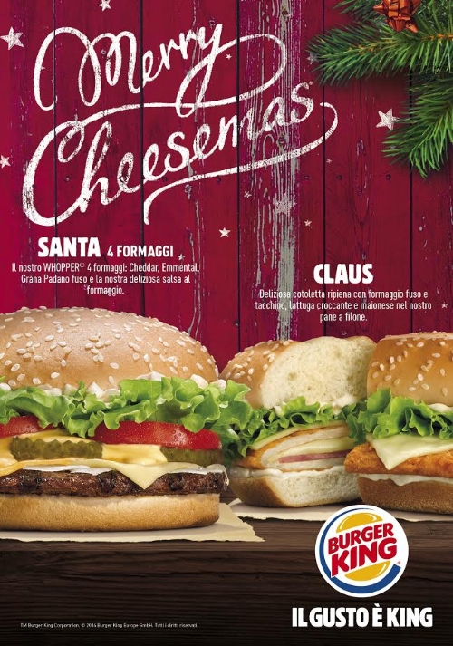 Tramite questa nuova campagna, ideata dall’agenzia creativa La Despensa e pianificata dall’agenzia media Starcom , Burger King vuole augurare a tutti Buon Natale a modo suo con un festoso “Merry Cheesemas!”. Protagonisti della speciale promozione sono due nuovi panini: SANTA 4 formaggi e CLAUS.
