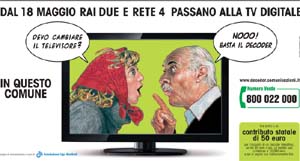 Dal 27 aprile è in onda per circa un mese, la campagna del Ministero delle Comunicazioni a cura della Fondazione Ugo Bordoni e ideata dalla Silvano Guidone e Ass, relativa al passaggio al digitale terrestre di 19 province di Piemonte, Lombardia ed Emilia Romagna. La pianificazione è a cura di Mediaitalia e coinvolge tv locali, stampa, affissione e radio.
