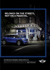 Lo spot TV di 30 secondi dal titolo “Street Attitude” presenta la MINI Paceman nel suo ambiente urbano. Gli spettatori seguono un giovane conducente alla guida di una MINI Paceman nel suo tragitto notturno verso casa, attraverso New York. Esce da un negozio di dischi e sale sulla MINI Paceman. Dopo una breve sosta in uno snack-bar asiatico, fa un giro elegante e sportivo per le strade e i vicoli della vivace città, passando per gallerie, bar alla moda e capolavori architettonici. Lo spettatore capisce dove è diretto il giovane solo quando la porta del garage si apre lentamente mostrando l’interno del suo loft. Perché non rendere la MINI Paceman parte del design dell’appartamento? Ci sono tre versioni dello spot con finali diversi.