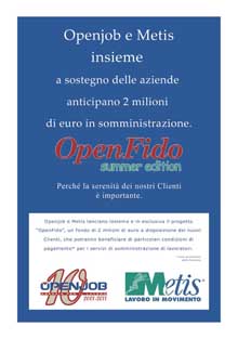 Un progetto esclusivo e fresco di lancio, che mette un plafond di 2 milioni di euro a disposizione delle aziende che sceglieranno per la prima volta di affidarsi a Openjob e Metis per le Risorse Umane nei mesi estivi. A corredo, una campagna una tantum che, seguendo una precisa scelta di marketing, si articola in un’unica pagina, intera, che verrà pubblicata nell’edizione nazionale di Libero datata 13 luglio 2011. La grafica - realizzata internamente e firmata dal team comunicazione Openjob - è estremamente elegante, pulita e diretta: uno sfondo blu veicola il messaggio più impattante “Openjob e Metis insieme a sostegno delle aziende anticipano 2 milioni di euro in somministrazione”, il claim legato all’iniziativa, che descrive al tempo stesso la filosofia aziendale “Perché la serenità dei nostri Clienti è importante”.