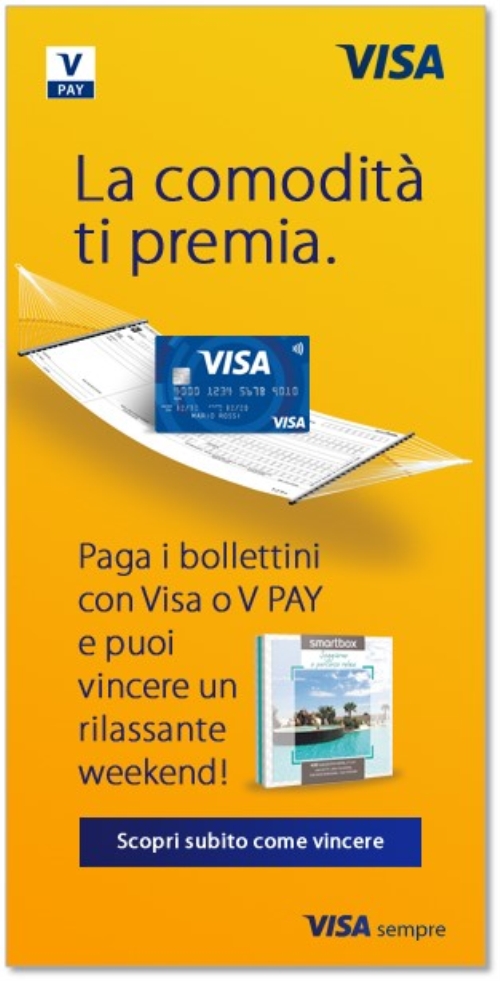 Pagando i bollettini con la carta Visa e V PAY e registrando i propri dati del pagamento in Rete (www.visaitalia.com), o inviando Sms, si ha l’opportunità di vincere istantaneamente centinaia di cofanetti viaggio week-end Smartbox che comprendono ciascuno un soggiorno e percorso benessere per due persone in 400 hotel in Italia e nel periodo prescelto.