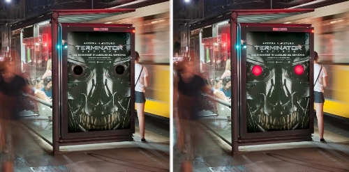 Milano. La creatività di 20 pensiline è stata arricchita da una speciale illuminazione a led dietro un particolare significativo, gli occhi di Terminator, che ad intermittenza si accendono di rosso rendendo la comunicazione particolarmente impattante e accattivante.