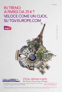 Con la nuova campagna, TGV Italia comunica inoltre le offerte SNCF per i viaggi dall’Italia per Parigi, grazie alle quali è possibile raggiungere la capitale francese con soli 25 Euro. Il Keyvisual della campagna riprende quello della precedente, che rappresenta il cuore di Parigi attraverso i suoi simboli più famosi, in un fish-eye che in un colpo d’occhio ci proietta nel centro della città.