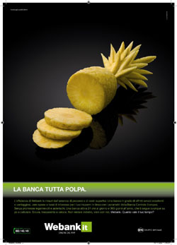 La metafora del visual mostra due soggetti 'frutta' diversi, ananas e fragola, la cui buccia è diventata polpa, come riporta l’headline: 'La banca tutta polpa'.