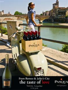 Per le bottiglie firmate Pasqua, la campagna prevede una serie di “scatti cartolina”, dal chiaro trattamento glamour-vintage e in pieno stile “Dolce Vita”, in cui la bellissima top model (veronese doc),Chiara Gugole, con la sua Vespa anni ‘50/60, fa da “Cicerone” in un viaggio fotografico eno-gastroculturale, naturalmente immortalato dall’obiettivo di Giò Martorana. Protagonisti assoluti di questi scatti d’autore, sono, infatti, oltre ai vini, le bellezze architettoniche di Verona: Le Arche Scaligere, l’Arena, Piazza delle Erbe, Lungadige e Ponte Pietra.