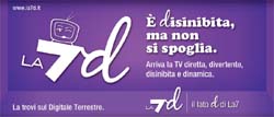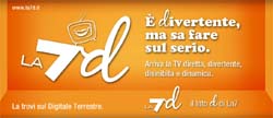 LA7d, il nuovo canale di Telecom Italia Media sul Digitale Terrestre si presenta al grande pubblico attraverso la sua prima campagna nazionale. La comunicazione, pianificata da novembre, viene declinata in affissione, stampa e web e presenta una grande scatola colorata - simbolo della tv e del suo variegato palinsesto - che diventa un vero e proprio contenitore attraverso il quale veicolare i tratti distintivi della rete.Peculiarità tutte racchiuse in una 'd' che fa la differenza: dinamica, divertente, disinibita e molto altro ancora. Il concetto è ribadito anche dal pay-
