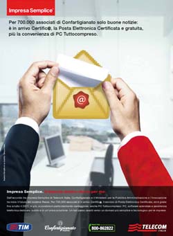 Da lunedì 12 luglio è on air su stampa la campagna di comunicazione dedicata all’accordo tra Impresa Semplice di Telecom Italia, Confartigianato e il Ministero per la Pubblica Amministrazione e l’Innovazione che permetterà a circa 700.000 imprenditori artigiani di attivare e utilizzare gratuitamente fino alla fine del 2011 il servizio di Posta Elettronica Certificata.