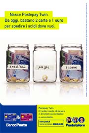 Ogilvy ha sviluppato una campagna stampa e affissione che si focalizza sui due benefit principali garantiti dal nuovo sistema Postepay Twin: la semplicità di utilizzo e la convenienza. Il visual principale è incentrato sull’immagine di 3 barattoli di vetro sui quali sono poste 3 etichette adesive, ciascuna delle quali riporta una scritta che descrive in maniera chiara e sintetica le principali azioni effettuabili grazie a Postepay Twin: 'spedisci', 'paghi', 'riceve'. L’headline della campagna è: 'Nasce Postepay Twin. Da Oggi, bastano 2 carte e 1 euro per spedire i soldi dove vuoi'.