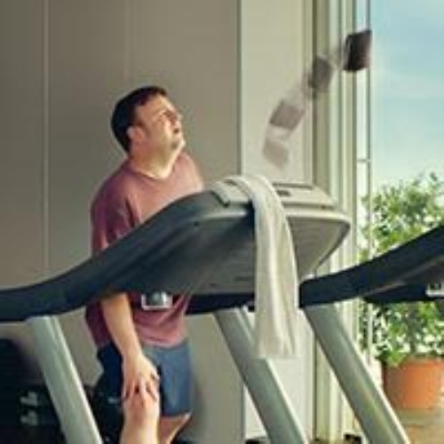 Nel secondo spot TV è invece un improvvisato ed impacciato atleta il nostro protagonista; vediamo lo stesso effetto del portafogli che fluttua all’ accadere di un infortunio sul tapis roulant di una palestra.