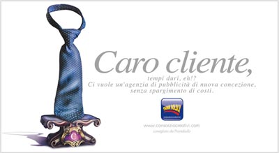 A sottolineare che si tratta di una iniziativa del cliente, una riga sotto il marchio ConsorzioCreativi: “consigliato da ProntoBollo”. Che un cliente di un’agenzia di pubblicità raccomandi la sua agenzia di pubblicità ai suoi clienti è la cosa migliore che possa accadere a un’agenzia di pubblicità.