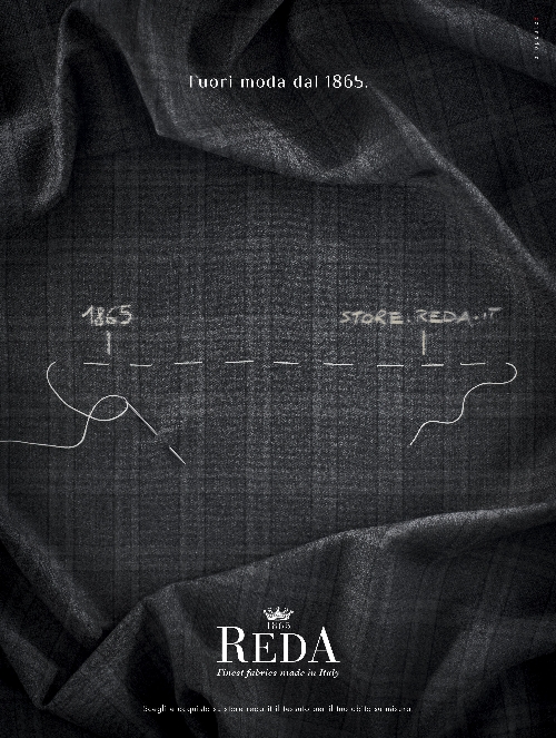 Un tessuto in fantasia “english” grigio antracite fa da sfondo all’orlo tracciato con ago e filo che simboleggia la linea temporale della tradizione Reda, nata nel 1865 nel mercato dell'alta sartoria.