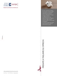 Nulla di superfluo, infatti, nella pagina adv, così come nelle metodologie aziendali JMAC: il margine tratteggiato è simbolo del sapiente cut da dare a sprechi di risorse, tempo ed energia, per far emergere potenzialità e plus, fornendo nuovo spazio alle caratteristiche di successo e al valore dell’azienda, rappresentate dal foglio bianco.