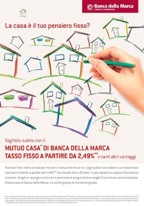 momento stanno pensando di acquistare o ristrutturare casa attraverso una comunicazione semplice e chiara. Infatti, da un lato il visual rappresenta in modo ironico il pensiero fisso per la casa, dall’altro l'headline “La casa è il tuo pensiero fisso? Toglitelo subito con mutuo casa di Banca della Marca tasso fisso a partire da 2,49%” trasmette sicurezza e fornisce già le informazioni principali del prodotto presentato.