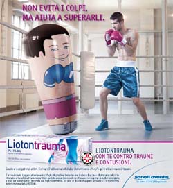 Nei mesi scorsi la campagna radio è stata anticipata dal soggetto stampa che mostrava un allenamento di boxe in cui uno dei due pugili, metafora del prodotto, era rappresentato come pungiball, perché grazie all’uso di Liotontrauma, i colpi ricevuti, senza poterli evitare, possono essere attutiti.