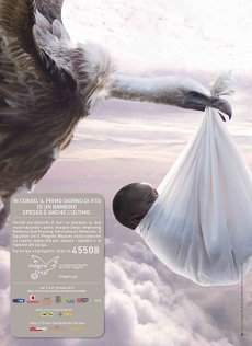 Ed è per questo, per creare un piccolo cortocircuito mentale che spinga a interessarsi ai contenuti della campagna, che il team creativo ha scelto di sostituire alla consueta immagine positiva della cicogna quella di un avvoltoio che vola tra cupe nuvole e regge nel becco un bimbo in fasce.
