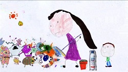 sul disegno, mostrandoci un germe sorridente che viene lavato da uno spazzolone per i pavimenti. Il disegno si anima ed i germi si moltiplicano minacciando il bambino, che non ha paura perché sa quello che sta per accadere.La mamma, infatti, ha in mano uno spazzolone ed una confezione di Lysoform, grazie ai quali riesce a fermare i germi prima che raggiungano il bambino, proteggendolo così dall’attacco.