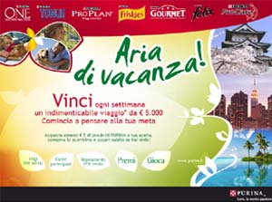 Fino al 30 luglio, acquistando almeno 5 € di prodotti a scelta tra i brand Purina e conservando lo scontrino si potrà partecipare al concorso. 'Aria di Vacanza' Purina sarà supportato inoltre da una campagna radiofonica da 30" on air dal 3 al 30 Maggio sulle principali emittenti nazionali e dal 17 Maggio al 30 Maggio sulle radio delle principali insegne della grande distribuzione.