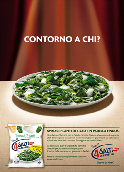 McCann Erickson presenta i contorni Quattro Salti in Padella Findus, con una campagna stampa in due soggetti, on air sui principali periodici nazionali da sabato 10 aprile 2010.La strategia di comunicazione parte dalla caratteristica distinativa del brand: la sapiente ricettazione degli ingredienti per ottenere la ricchezza del sapore, coerentemente sintetizzati nel pay-off 'Gusto da chef'.
