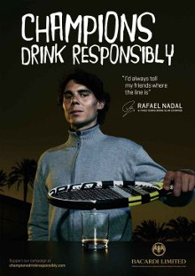 Rafael Nadal, poche ore prima di cominciare il torneo di Key Biscayne, l’isola di Miami, ha firmato per tre anni un contratto con la Bacardi per la nuova campagna sul bere responsabile. E’ la seconda volta che il brand sceglie un testimonial nel mondo dello sport per renderlo un chiaro esempio di bere responsabile; il primo era stato il campione di Fromula Uno Michael Schumacher). La nuova campagna si chiama ‘Champions drink responsibly’ e ha permesso di contattare 37 milioni di persone in tutto il mondo. ‘Mi sforzerò di far capire che, a cominciare da me, non bisogna mai superare la linea del pericolo’, dichiara il campione, ammettendo di aver superato qualche volta la ‘linea della responsabilità’.
