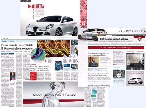 E’ in corso in questi giorni la campagna Alfa Romeo per il lancio della nuova Alfa Giulietta. Per l’occasione RCS Pubblicità ha strutturato, insieme a Maxus MC2, una proposta di comunicazione multimediale personalizzata, che vede la realizzazione di nuove posizioni e di formati speciali. Su Corriere della Sera, innovativa la 'domination' di prima pagina ed una serie di formati inediti (doppia finestrella centrale, doppio quadrotto centrato, tre colonne) nelle prime cinque pagine del quotidiano.