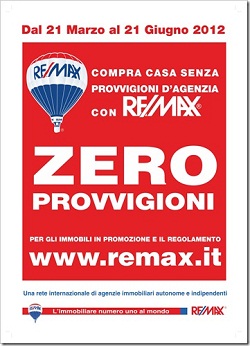 RE/MAX Italia ha deciso di smuovere il mercato del mattone con un’operazione che sicuramente non lascerà indifferenti venditori e acquirenti: fino al 21 giugno sarà infatti attiva per la prima volta in Italia l’Operazione 'Zero provvigioni dall'acquirente'."Ancora una volta RE/MAX Italia, per fronteggiare il difficile momento del mercato, lancia una nuova iniziativa che sicuramente creerà la chiave di svolta nel settore delle intermediazioni immobiliari. Con l’operazione Zero provvigioni offriamo infatti vantaggi sia all’acquirente, che non si troverà a dover affrontare la spesa legata al pagamento delle provvigioni dovute all’intermediazione d’agenzia, sia al venditore che aderendo a questa promozione, potrà godere di una maggior visibilità e attirare un maggior numero di acquirenti oltre ad avrà ottime possibilità di vendere in tempi brevi il suo immobile", commenta Dario Castiglia, Presidente e Amministratore Delegato RE/MAX Italia.