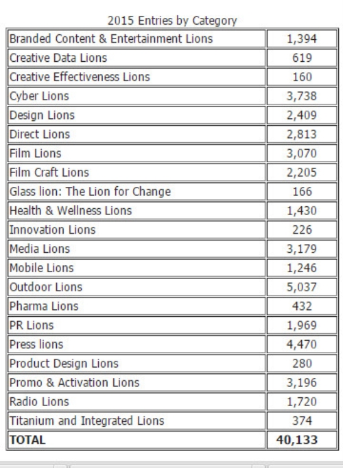 Sono ben 40.133 i progetti iscritti al Festival di Cannes 2015 , un numero record, a cui hanno contribuito le 37.426 entries dei tradizionali Cannes Lions (21-27 giugno), le 1.862 entries (+30%) dei Lions Health (19-20 giugno) e le 845 dei Lions Innovation (25-26 giugno).