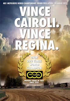 Un successo “Proudly Made in Italy since 1919”, da comunicare attraverso una campagna innovativa ideata dall’agenzia di Michael Goettsche. Il primo soggetto, uscito il 16 luglio, celebra la vittoria di Cairoli nel Gran Premio di Motocross della Lettonia con il titolo “Vince Cairoli. Vince Regina”, ambientato nel circuito della gara.