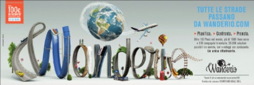 L’agenzia Armando Testa ha dunque pensato di elaborare in 3D il logo Wanderio utilizzando diversi tipi di strade, da viali alberati alle rotaie, dalla pista dell’aeroporto ai percorsi marittimi. Chiude il concetto: Tutte le strade passano da Wanderio.com.