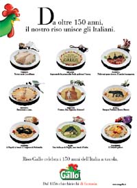 Riso Gallo, tra le più grandi riserie d’Europa e tra le più antiche industrie alimentari italiane, con oltre 150 anni di storia, ha deciso di festeggiare i 150 anni dell’unità d’Italia con una campagna stampa di grande effetto, in uscita sui principali quotidiani nazionali e locali, esclusivamente nella giornata del 17 marzo, che recita: 'Da oltre 150 anni, il nostro riso unisce gli Italiani. Riso Gallo celebra i 150 anni dell’Italia a tavola. Dal 1856 chicchiricchi di fantasia'. Un viaggio gastronomico che percorre l’Italia da Torino a Palermo, attraverso nove appetitosi risotti, che rappresentano gli emblemi più rinomati d’Italia, caratterizzati da immagini di invitanti piatti, di straordinario appeal e forte emotività.