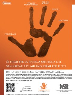 Saatchi & Saatchi e la Fondazione San Raffaele di Milano lanciano una nuova campagna di comunicazione per la donazione del 5 per mille. Obiettivo della campagna è mettere in risalto un tema molto delicato e attuale come quello della ricerca scientifica.Si tratta della salute della popolazione italiana, un argomento di interesse generale che coinvolge malati e non. Per questo motivo la creatività si rivolge a tutti, evidenziando l’importanza della collaborazione per superare le più grandi sfide in campo medico. Sia nella stampa che nello spot tv ritorna il simbolo della mano, che con una firma può devolvere il 5 per mille alla Fondazione San Raffaele. Un semplice gesto che può rivelarsi una grande conquista per l’umanità.