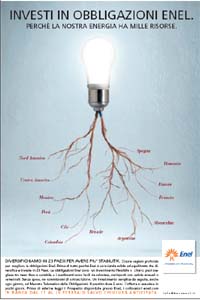 Per sostenere il collocamento delle obbligazioni, dal 12 al 26 febbraio Enel comunica, in Italia e all’estero, con una campagna integrata ideata da Saatchi & Saatchi.L’obiettivo è quello di rafforzare l’immagine di equilibrio e solidità di Enel che deriva dalla sua strategia di diversificazione: un valore per il brand stesso, ma soprattutto per gli investitori e i risparmiatori.