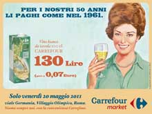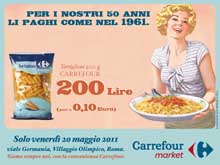 Vi piacerebbe pagare un chilo di pasta quanto 50 anni fa? Bene, per un giorno i romani potranno farlo. Saatchi & Saatchi per celebrare i 50 anni del Carrefour Market di Roma, uno dei primi supermercati ad aprire in Italia, ha ideato una campagna pubblicitaria che permetterà ai consumatori di tornare indietro nel tempo e fare la spesa esattamente come allora.L’operazione testimonia ancora una volta la volontà di Carrefour di proporre ai propri clienti un’offerta estremamente conveniente e competitiva, in piena linea col posizionamento internazionale della marca: Ogni giorno è positivo. L’idea creativa attorno alla quale è stato articolato tutto il progetto è appunto: Per un giorno, li paghi come nel 1961. Solo per un giorno, infatti, sarà possibile acquistare alcuni prodotti al prezzo di 50 anni fa.