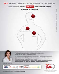 Sempre sulla linea della fermezza, la body contiene una dichiarazione della presidente di Alt diretta a chiunque possa inviare un sms per sostenere l’attività di ricerca dell’associazione e riporta, inoltre, dati che fanno riflettere. La body recita infatti così: 'Aiutaci a fermare la trombosi. Invia anche tu un Sms. Grazie!!' Dr.ssa Lidia Rota Vender - Presidente ALT Onlus.