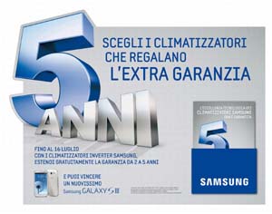 Dal 9 giugno al 16 luglio chi acquista un climatizzatore Inverter Samsung può estendere gratuitamente la garanzia da 2 a 5 anni oltre che partecipare all’estrazione finale di uno dei venti Samsung Galaxy S III in palio.