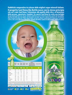 Questa strategia di comunicazione immediata e trasparente si è rivelata vincente ed ha conquistato il consumatore. Il format, la cui creatività è curata da Between, è molto semplice e si lega all’informazione piuttosto che alla promozione pura del prodotto. L’Azienda ha infatti voluto utilizzare gli spazi sulla carta stampata per illustrare al consumatore tutti i plus di questo packaging unico che introduce davvero una rivoluzione epocale nel mondo del mass market. I tre formati di Sant’Anna Bio Bottle da 0.5, 1 e 1.5lt sono affiancati, oltre che da una scheda organolettica dell’acqua Sant’Anna, da un box informativo che impartisce ai lettori una vera lezione sul mondo dell’acqua e sull’ambiente in generale.