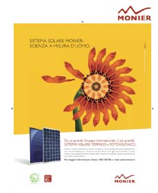 Questo pensiero è condiviso da Monier che, con il suo fare, intende risvegliare un senso di responsabilità civile, introducendo un linguaggio innovativo in grado di esaltare il legame tra uomo e ambiente. Nella nuova campagna pubblicitaria, sintetizzata dal claim “Scienza a misura d’uomo”, Monier utilizza l’immagine di un girasole, nato dal talento artistico di Cecelia Webber, nel quale la figura umana diviene un tutt’uno con la natura: il fiore, infatti, è realizzato da un insieme di corpi nudi che ne compongono la corolla, mentre il braccio dell’uomo ne diviene lo stelo.