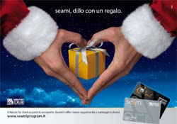 'Seami, dillo con un regalo' è il suadente claim della campagna nella quale si vede un moderno Babbo Natale porgere con le proprie mani a forma di cuore un pacchetto regalo. La pianificazione prevede l’affissione per tutto il periodo natalizio sui maxi formati all’interno dell’aeroporto e uno spot di 30” pianificato sul circuito interno degli LCD. A completare il tutto una buona comunicazione on line, con il lancio del nuovo sito rivisitato in chiave natalizia e una massiccia campagna di direct marketing, sviluppata in collaborazione con Jakala Marketing Solutions.