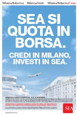 La quotazione in Borsa della società che gestisce gli aereoporti di Milano Linate e Milano Malpensa è al centro di una campagna pubblicitaria pianificata su tutti i maggiori quotidiani e nazionali e locali, con mirate apparizioni sui periodici, in particolare finanziari, radio RAI e Radio 24. La pianificazione prosegue sul territorio attraverso affissioni e circuiti LCD, in collaborazione con IGP Decaux, con spazi di alta visibilità sia all’interno che fuori gli aeroporti. Il piano media è a cura di Media Village.