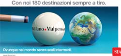 Ad affiancare la campagna istituzionale, tutt’ora on air nei circuiti aeroportuali e nelle postazioni limitrofe agli aeroporti, SEA presenta un’iniziativa interamente centrata su Milano Malpensa. Obiettivo della campagna, ancora una volta firmata dall’agenzia Cernuto Pizzigoni & Partners, è comunicare il numero record di destinazioni raggiungibili con voli diretti dallo scalo milanese.Una stecca da biliardo pronta a colpire due palle ravvicinate, la seconda delle quali raffigura il mondo, è il visual di campagna, accompagnato da una headline che recita: 'con noi 180 destinazioni sempre a tiro'. Questo il racconto dell’immediatezza con la quale l’aeroporto di Milano Malpensa permette ai viaggiatori di raggiungere luoghi in tutto il mondo senza stopovers. Sono infatti 180 le destinazioni collegate a Malpensa tramite voli diretti.