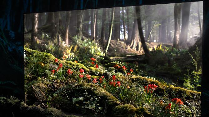 La scena si apre con un’ampia inquadratura della foresta, immersa nella tranquillità subito dopo il tramonto: la telecamera si addentra poi nel bosco incantato e trova un TV BRAVIA OLED, che si accende rivelando i colori, i contrasti e i dettagli autentici della foresta, come una “finestra nel giorno”.