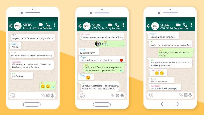 Sfera Commmunication ha ideato una campagna per raccontare di sé e del suo approccio alla comunicazione. Lo ha fatto con lo spirito che la contraddistingue – curioso, schietto, entusiasta - e, proprio per questo, ha deciso di rendere pubblico il primo backstage di una pagina stampa. Un backstage che diventa parte integrante della campagna stessa, contribuendo a raccontare scherzosamente il processo creativo e la vision di Sfera: restituire coinvolgimento utilizzando la forma più idonea al racconto. In questo caso, anche una (im)probabile chat di Whatsapp.
